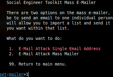 3. Thereafter, we are presented with two options. The first is to dispatch the email to a single recipient, while the second is to gather multiple user email addresses and send the deceptive site or message to all of them. For the purposes of this tutorial, the first option has been selected.